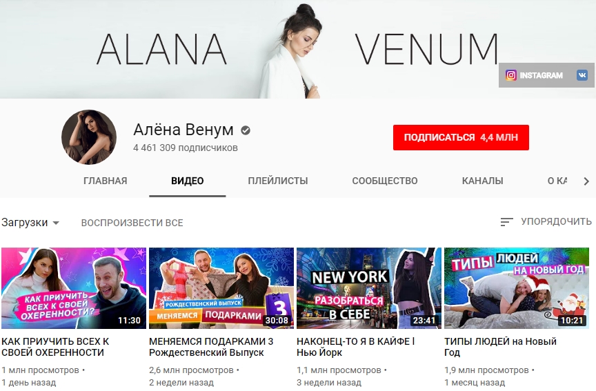 Алена продолжает публиковать много роликов — в основном это юмористические видео, которые она теперь снимает на пару с Дэрилом. Многие из них по понятным причинам посвящены родам, маленьким детям и прочим типичным «мамским» темам. Повзрослела и аудитория Венум: если раньше ее в основном фолловили тинейджеры, то теперь среди подписчиков все больше «мамочек в декрете».