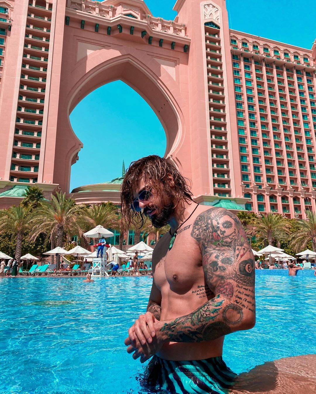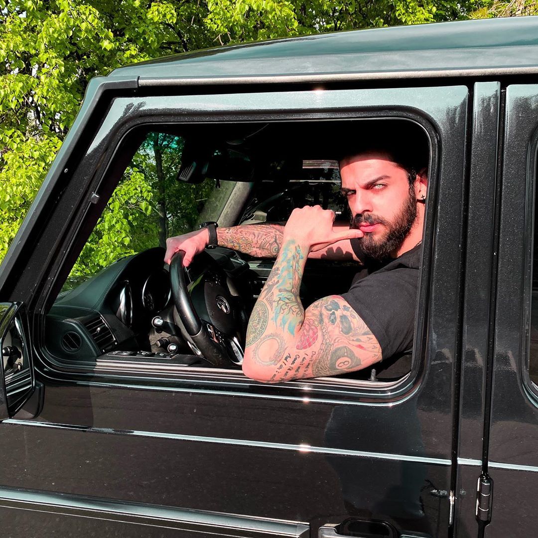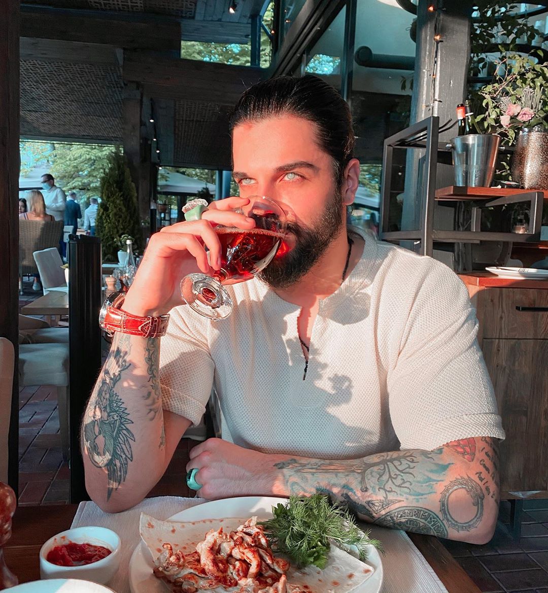 Правую руку украшают девушка-ангел, пальма, Медуза Горгона, компас с глазом посередине и дракон. На левой руке изображены меч, скандинавское дерево, лев с короной на голове, граната в виде сердца, змея и слова из песни группы Aerosmith. Также парень решил, что на его теле должна присутствовать дата знакомства с Алёной. А позже пара набила одинаковые татуировки в виде сердца, вписанного в звезду. |