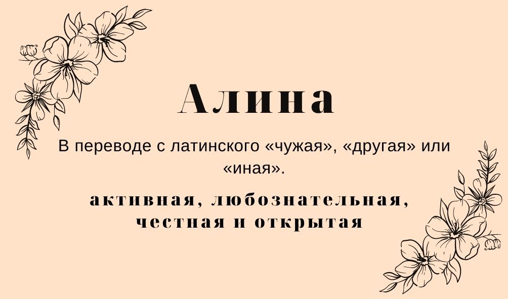 Алина – красивое имя, происхождение которого до сих пор точно не установлено. Некоторые историки считают, что оно имеет латинские корни и в переводе означает «чужая», «иная», «другая». Также его связывают с латинским именем Альбина (лат. albus), что переводится как «белая», «светлая», «светловолосая».