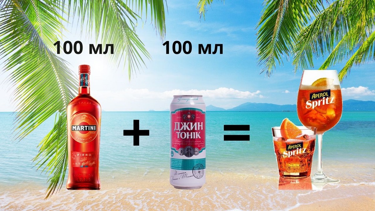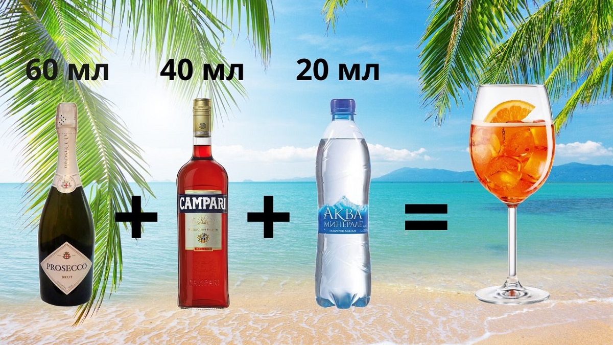 - 50 мл апероля, 50 мл игристого вина и 50 мл газировки. Эта пропорция превращает коктейль в типичный для многих баров. При этом сам биттер часто заменяют на любой апельсиновый ликер, а вино на шампанское (даже на «Советское»)