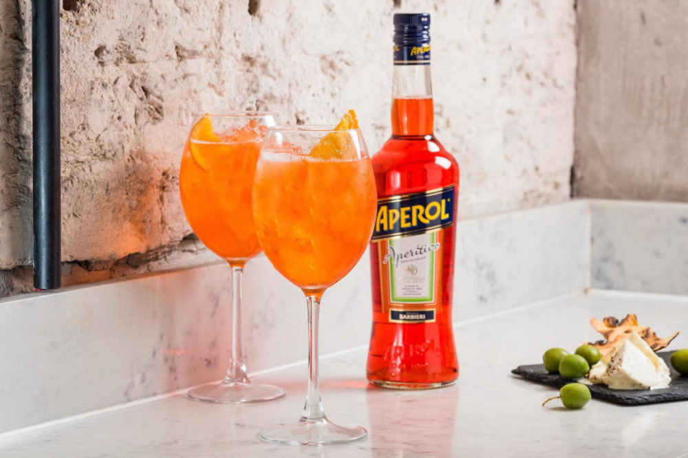 - Апероль — ярко-оранжевый аперитив. Производитель описывает его как «пикантный апельсин со сложными травяными ароматами, гармонирующими с нотками ванили». Его следует искать в продаже в отделе с ликерами.