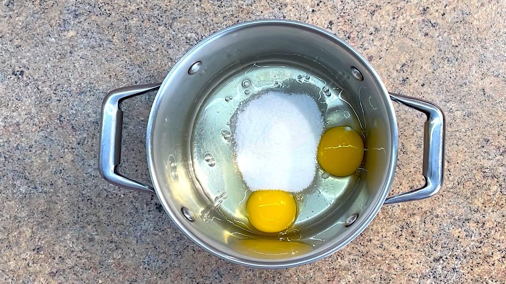 Сахар смешать с водой в отдельной кастрюле и поставить на средний огонь. Яйца тщательно помыть. Это существенно уменьшает вероятность различных заболеваний. Отделить яичные белки и убрать в холодильник охлаждаться. Охлаждённые белки взбиваются намного легче и качественнее. Сахарный сироп довести до кипения и варить на маленьком огне.