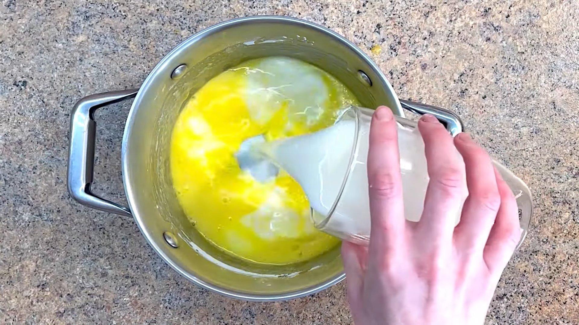 Непрерывно помешивая яичную смесь, тонкой струйкой вливаем в нее половину молока. Если влить все молоко сразу, то яйца свернутся и образуют комки.