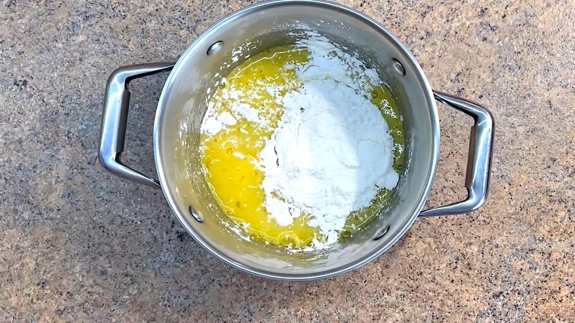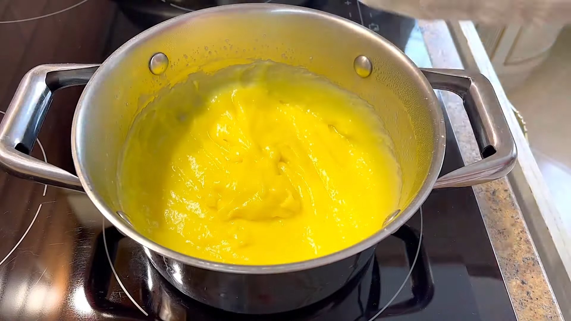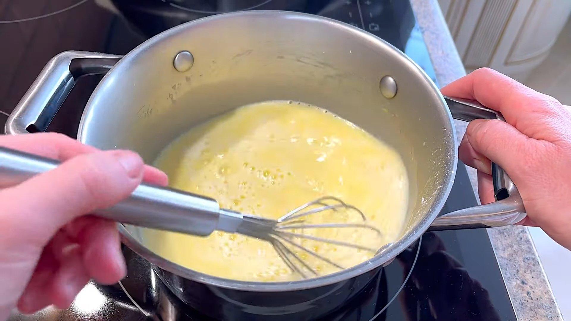 Вливаем яичную смесь в сотейник с оставшимся молоком, тщательно перемешиваем и ставим на небольшой огонь.