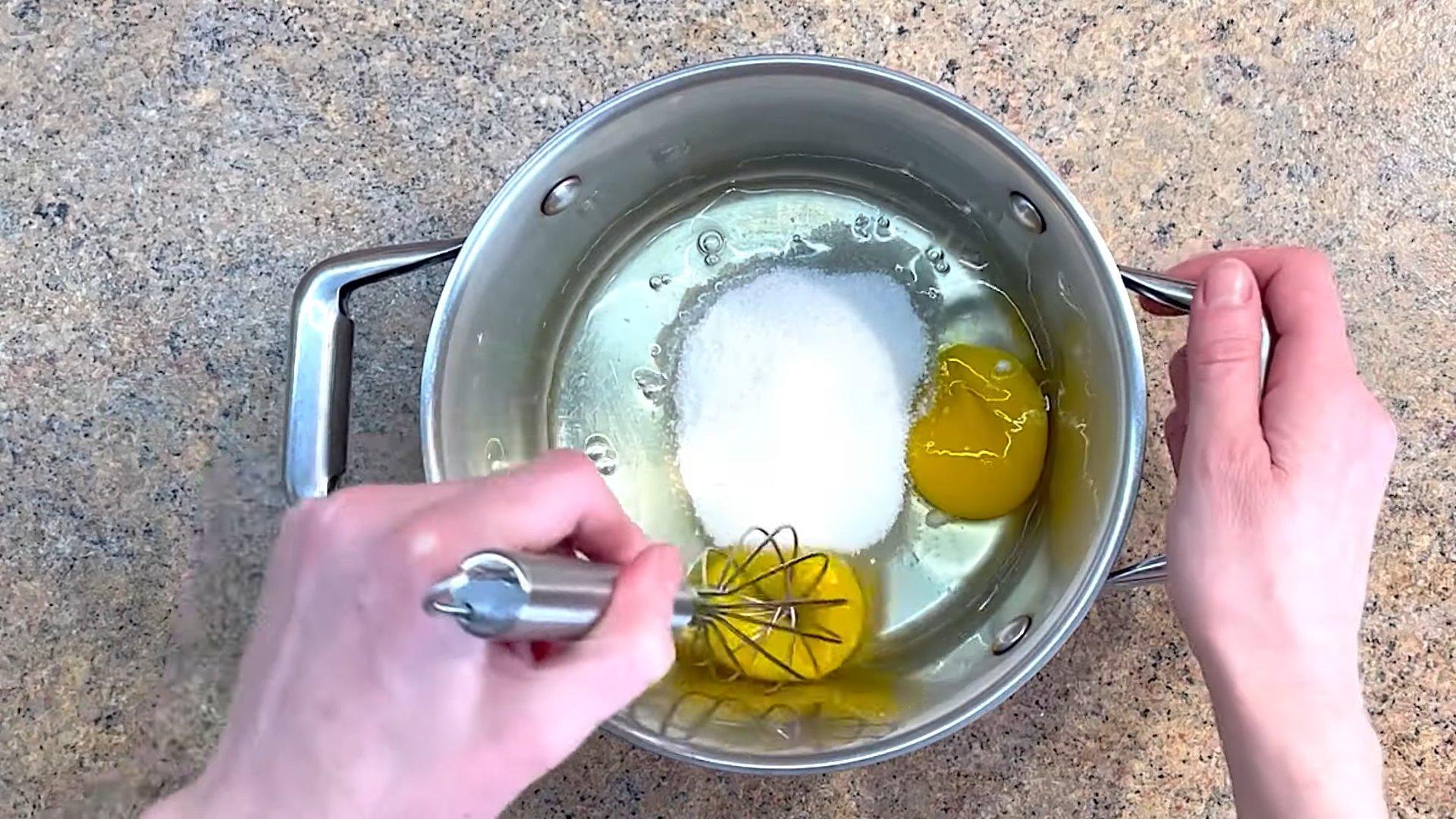 - Завариваем белки сахарным сиропом. Можно, конечно, не заваривать, но, с точки зрения безопасности, термический процесс позволяет избавиться от инфекций, живущих в сырых белках.