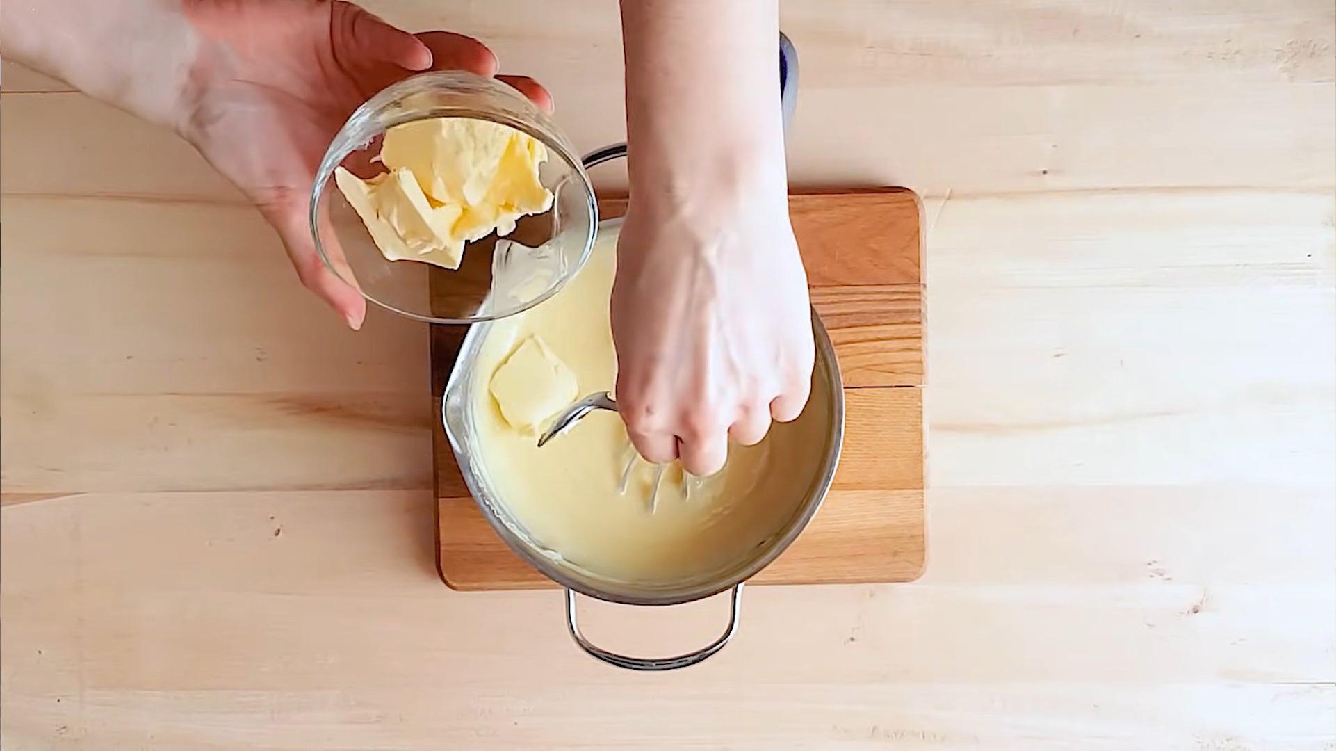 Снимаем крем с огня. В 2-3 приема вводим в него сливочное масло комнатной температуры и тщательно перемешиваем.