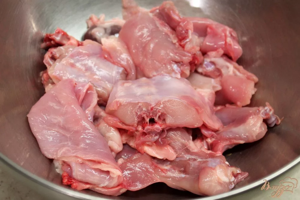 1. Вымойте тушку кролика, и нарежьте ее небольшими порционными кусками.