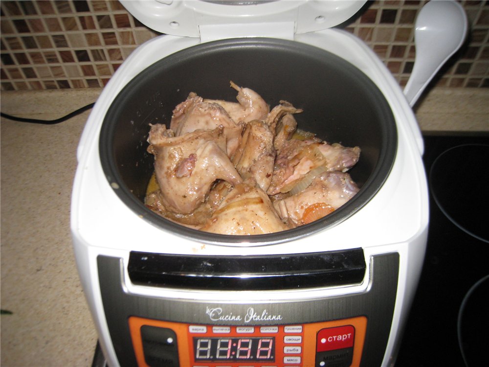 - В режиме «Жарка» подрумянивают на масле ломти крольчатины.