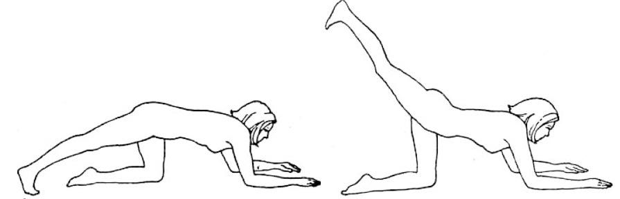 Займите колено-локтевое положение с выпрямленной задней ногой. Можно поставить пальцы на пол. В перерыве поднимите выпрямленную ногу и подержите ее 10 секунд. Для каждой ноги сделайте по 3 повторения.