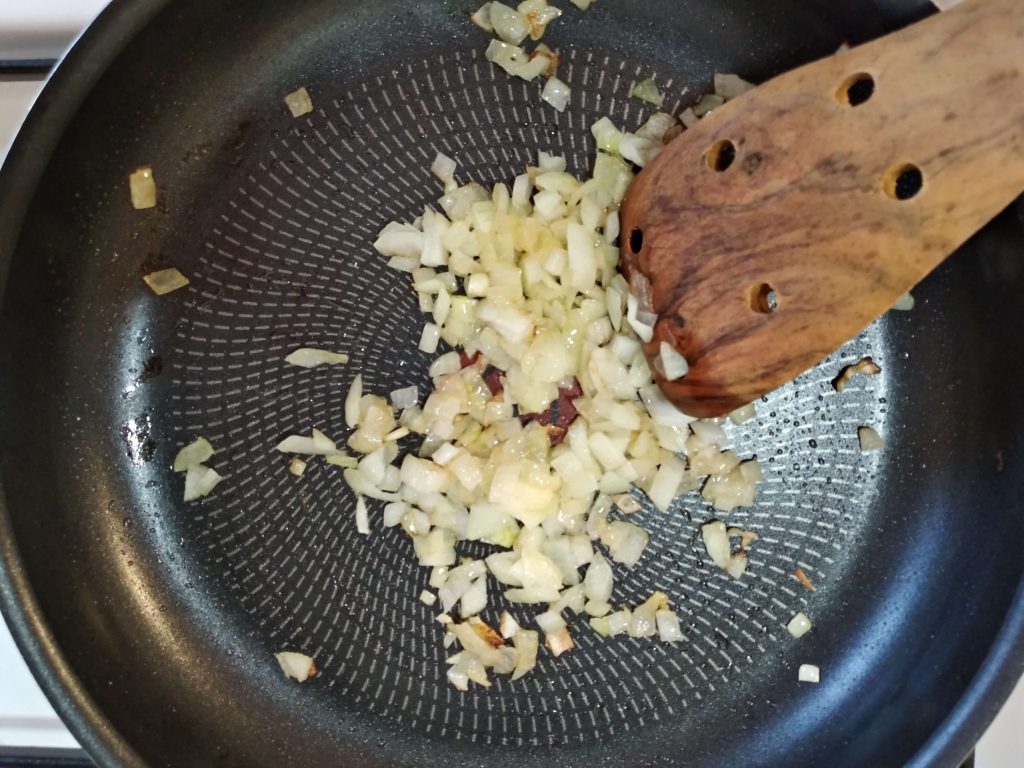 Займемся поджаркой для борща. Лук порежьте на мелкие кубики и обжарьте в предварительно разогретой сковороде с маслом до светло золотистого цвета.