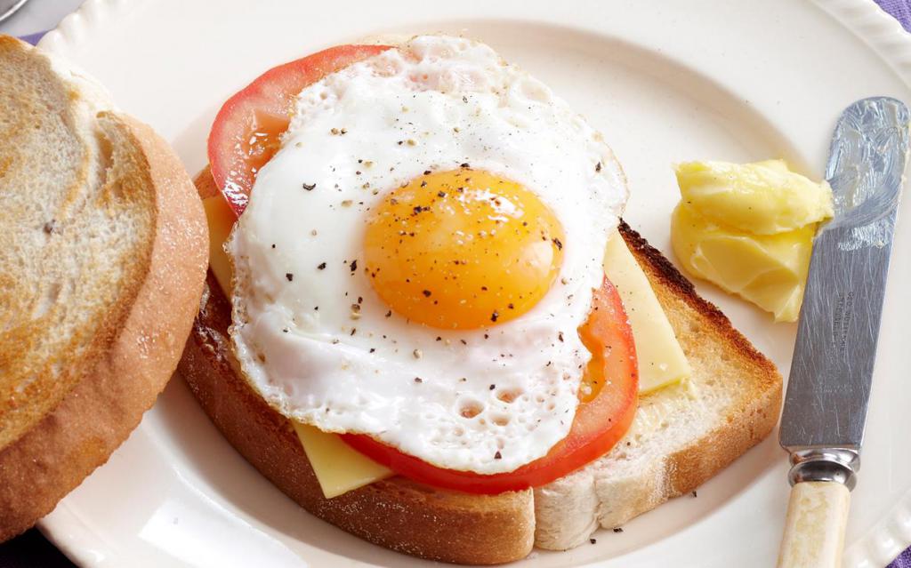 Любители яичницы могут разнообразить свою трапезу, добавив хлеб и немного овощей. Для придания блюду сочности, замените свежий огурец соленым и добавьте немного кетчупа или другого томатного соуса.
