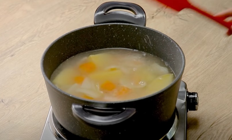 - Доводим жидкость до состояния кипения и выкладываем в нее подготовленные морковь и картофелины.
