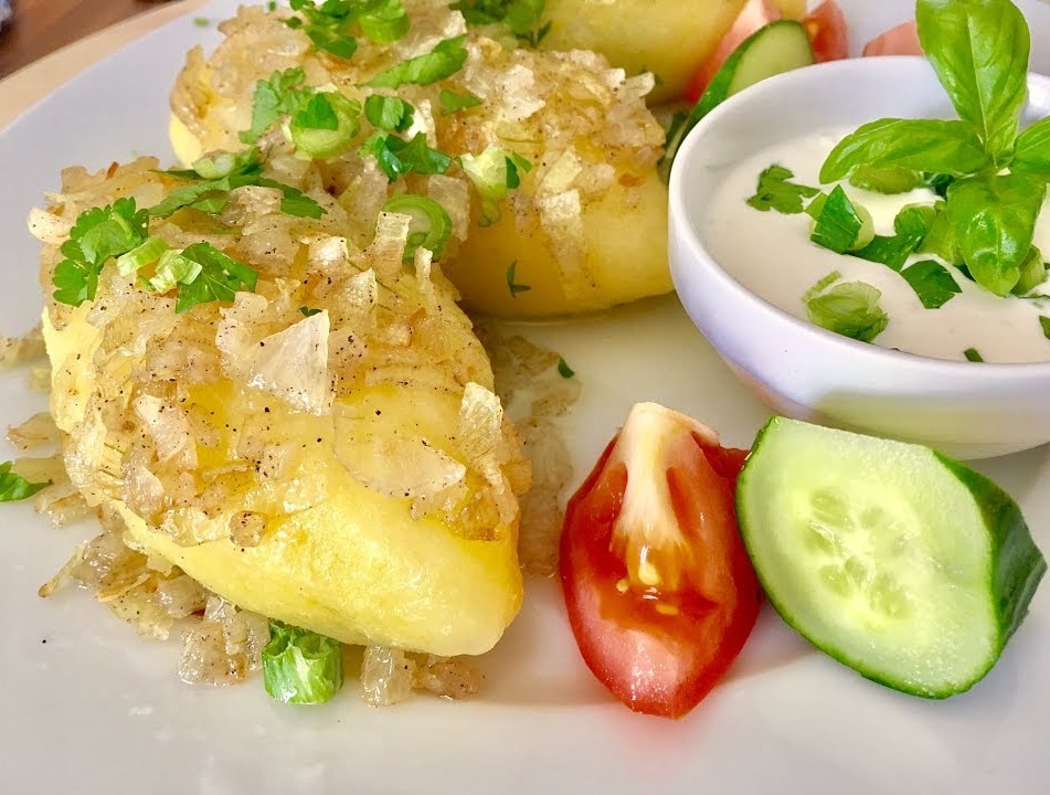 9.Достаньте осторожно шумовкой готовые цеппелины и полейте сметанным соусом со шкварками. Приятного аппетита и вкусных цеппелинов!
