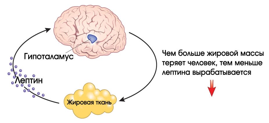 Жировые клетки нашего организма, вырабатывают особый гормон ЛЕПТИН. Уровень выработки зависит от количества жировой ткани. Т.е. чем больше жировой массы теряет человек, тем меньше лептина вырабатывается. Сам гормон участвует в обмене веществ и распределении энергии, а так же вместе с пищевым центром и гипоталамусом, контролирует чувство голода и насыщения.
