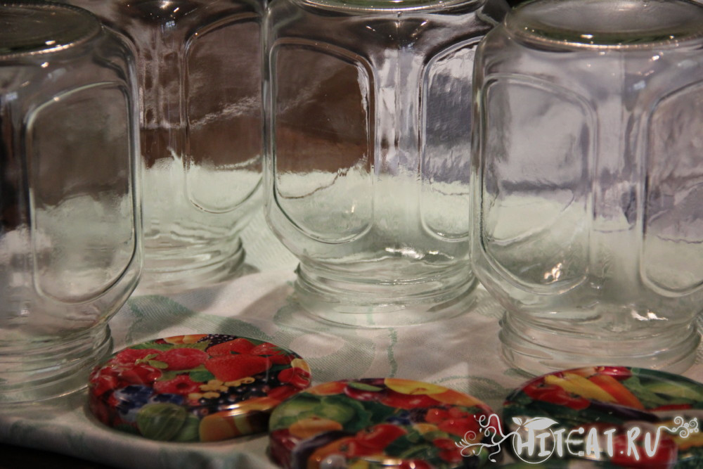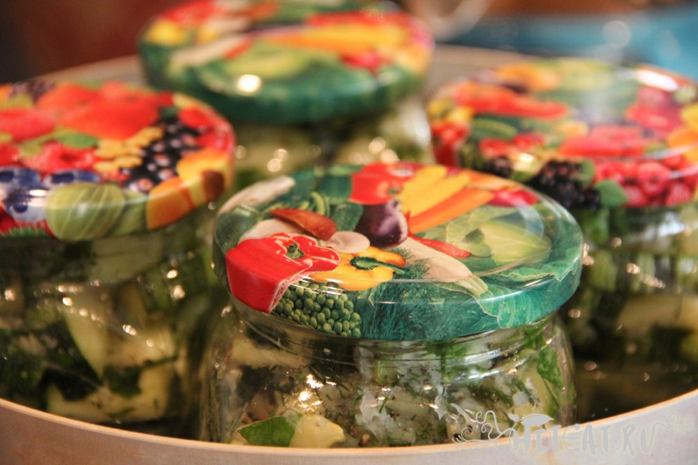- Затем заготовка распределяется по чистым банкам. При этом овощи следует утрамбовывать. Банка прикрывается крышкой, ставится стерилизоваться на 15 минут, а затем закатывается крышкой.