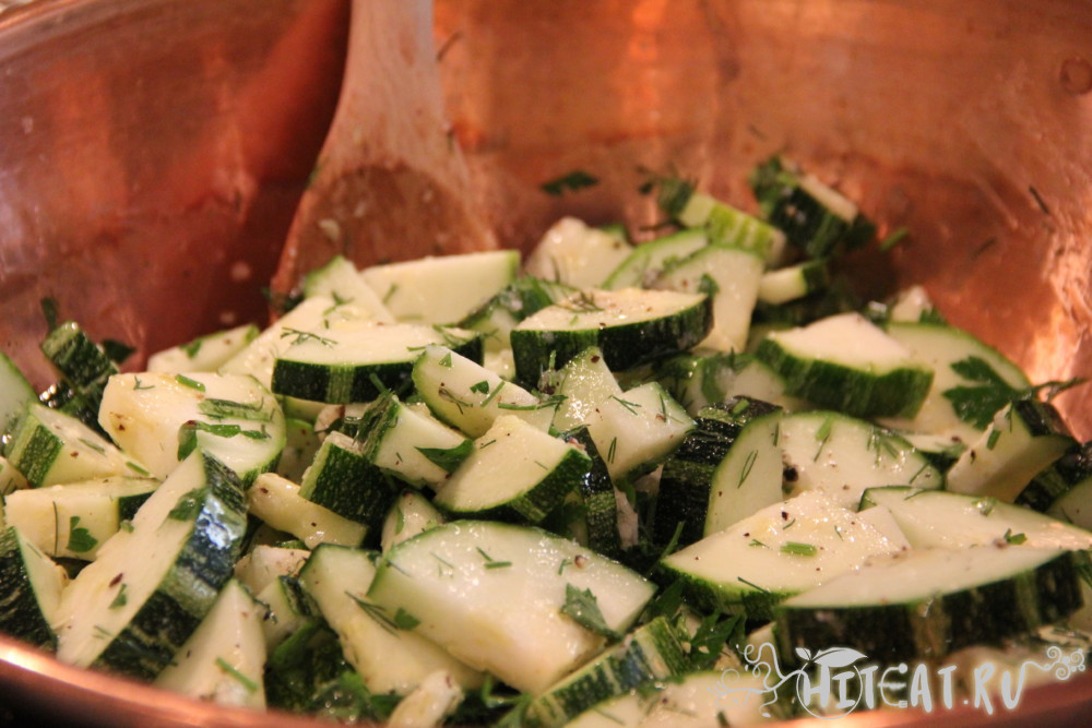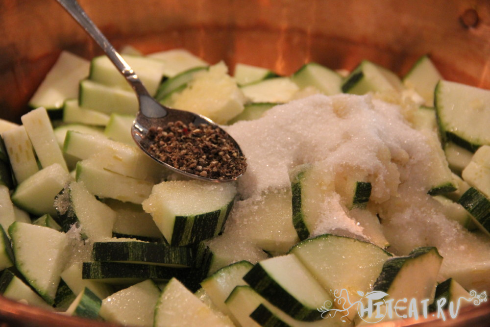 - Солим и приправляем цукини перчиком, добавляем чесночную массу и немного измельченного сыра.