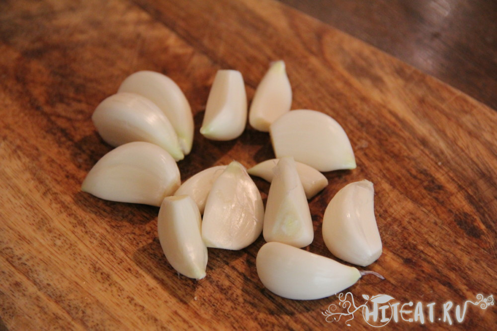 Чеснок чистим и режим тонкими пластинками. Мне нравится когда чеснок нарезан именно тонко, а вы можете попробовать разную нарезку и найти свой любимый размер.