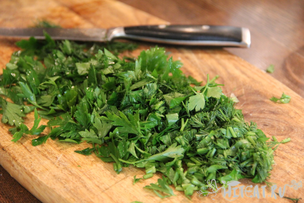 4.Зелень можете взять любую или не использовать ее вообще. В данном случае использовался базилик и петрушка, мелко порезанные.