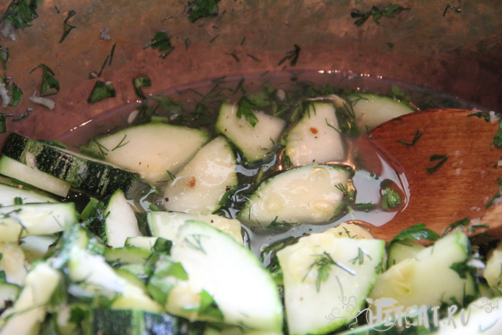 - Солим кабачковые кусочки, затем перчим их, посыпаем травами и обваливаем в муке.