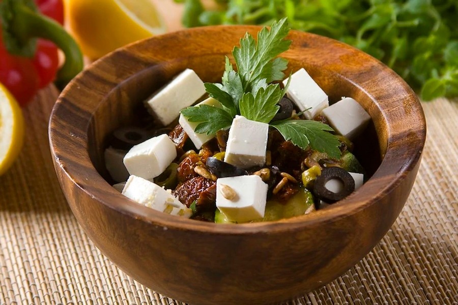 Сыр порезать на кусочки и добавить в салат. Все это поместить на полчаса в холодильник.
