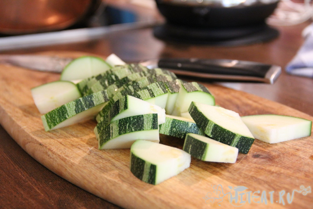 - Цукини промываем и обсушиваем. Нарезаем их брусочками или кружками.