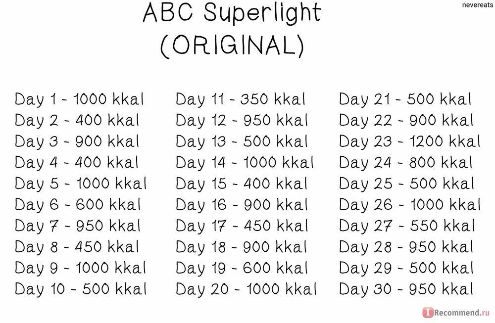 Второй вид системы — 30-дневная диета ABC light. Количество калорий колеблется каждый день от 300 до 700, плюс режим голодания для похудения.