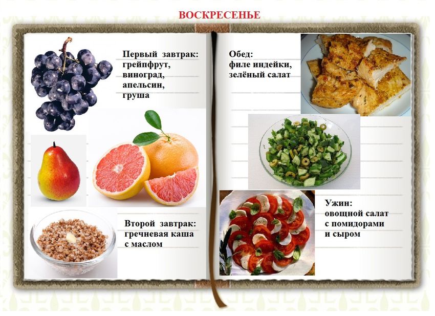 – Воскресенье – выход из 7-дневной диеты, для которого характерно сочетание базовых продуктов диетической недели.