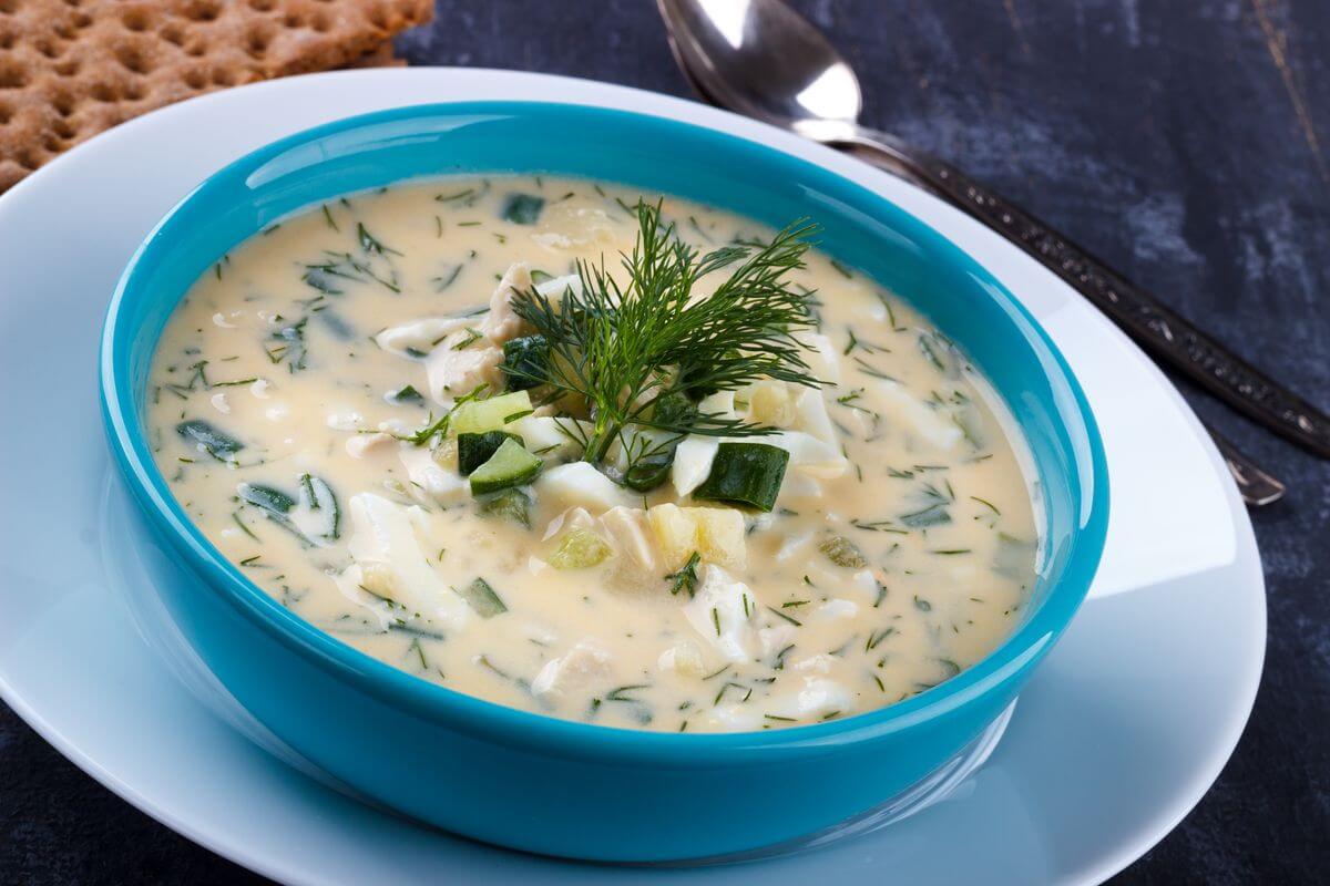 - 1,5 л молочнокислого напитка смешивается с натертыми огурцами и зеленью – укропом, кинзой, петрушкой, рукколой, перьями зеленого лука;