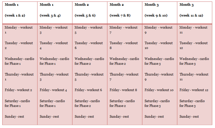 Кардио тренировку мы делаем 1 месяц в среду и пятницу, затем меняем, для каждой фазы она своя. Основные тренировки меняются каждые 2 недели, таким образом каждая фаза содержит 2 набора тренировок. Воскресенье всегда выходной-отдыхайте)