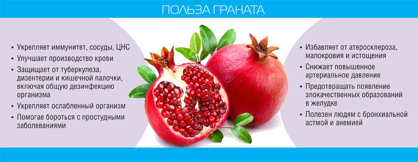 Специалистами доказана высокая эффективность граната в отношении простудных заболеваний. Фрукт насыщает организм витаминами, тем самым повышая иммунную защиту. Он также незаменим при пониженном уровне гемоглобина в организме. За счет присутствия в составе граната дубильных веществ устраняется кишечная палочка. При умеренном употреблении он также способен восстанавливать работу нервной системы. В некоторых случаях его используют в целях снижения температуры тела.