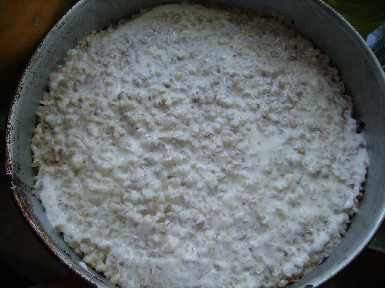 Соединить жидкую смесь с гречнево-творожной массой. Перемешать.