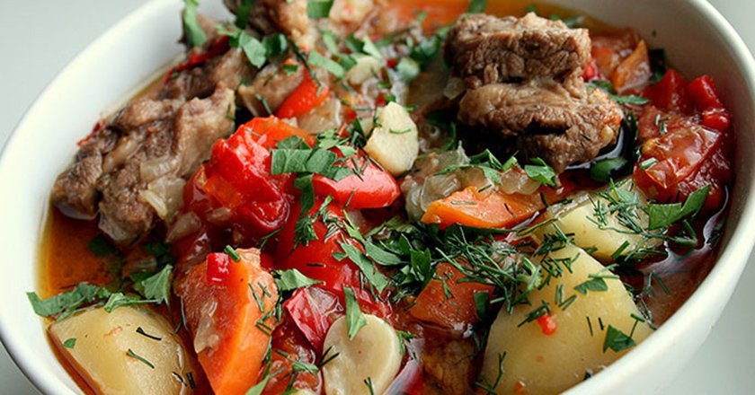 Перед тем как мы начнем варить хашламу, посмотрим еще раз на рецепт. В нем указано вино, но если блюдо будут кушать дети, лучше использовать воду. Когда-то суп, похожий на овощное рагу с большим количеством мяса, был основным кушаньем в рационе горцев. Он идеально подходил к их условиям жизни. Быстро готовился, содержал много витаминов и белка, восполнял потери организма, давал энергию. Кроме того, все его ингредиенты не требовали долгих поисков. Баранов держали большинство семей в горных поселениях, овощи и приправы выращивались на огородах. Рецепт блюда составлялся из имеющихся продуктов, но неизменно представлял собой густой овощной суп, в котором мяса даже больше, чем овощей. Что же, приступим и мы к приготовлению хашламы.
