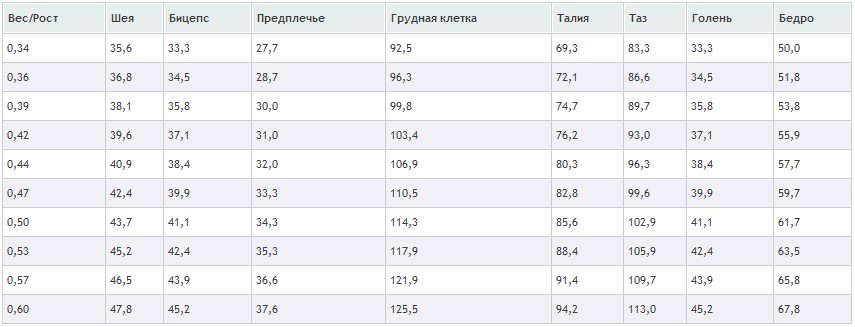 Коэффициент “Вес/рост” – это соотношение Вашего веса (в килограммах) к росту (в сантиметрах). Например, Ваш вес равен 70 кг, а рост 180 см, значит ближе всего к Вашему коэффициенту (0,388) значение 0,39, следовательно, смотрим пропорции ему соответствующие.