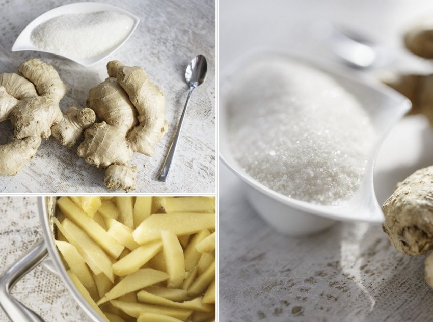 Для приготовления цукатов понадобятся: вода, сахар и имбирь. От возраста основного ингредиента зависит, насколько жгучими получатся «таблетки» от простуды. Чем старше корень, тем более острым получится лекарство. Острота зависит также от толщины ломтиков.