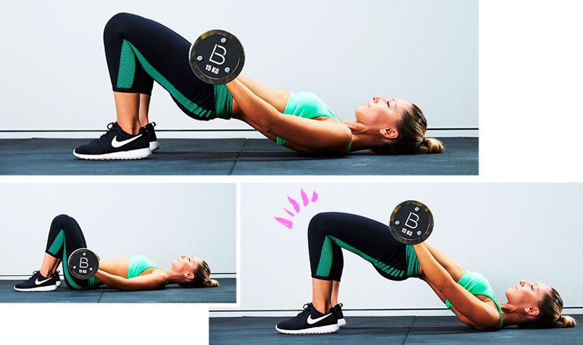 В верхней точке подъема слегка подкручивайте таз вперед, чтобы усилить нагрузку на низ ягодиц.