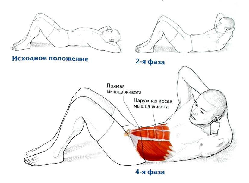 Начальное положение при прямом скручивании: лежа на спине, руки лучше расположить за головой, ноги согнуты в коленях. Требуется подтянуть плечевой пояс к тазу, округлив спину, и задержаться в таком положении на несколько секунд, затем медленно вернуться в исходное положение. Не надо путать это упражнение с «подъемами туловища» — при скручивании поясница не должна отрываться от пола. Такая техника эффективно прокачивает верхнюю и нижнюю часть прямой мышцы живота. Если проработки требуют косые мышцы живота, тогда можно воспользоваться диагональными скручиваниями. Исходное положение лежа на спине, икры ног на скамье (или любой удобной возвышенности), руки за головой. Требуется скрутить правый локоть по направлению к левому колену, задержаться на несколько секунд (поясница прижата к полу). Вернуться в начальное положение, затем повторить с левым локтем в направлении правого колена.
