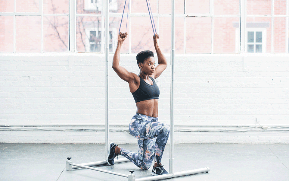 Наступите левой ногой на центр резины, а оба конца полосы захватите ладонями, согнутые локти плотно прижмите к торсу. Сделайте шаг вперед правой ногой и согните ее в колене (как позиция выпада). Вытяните руки с лентой перед грудью ладонями вверх. Вернитесь в стартовое положение.