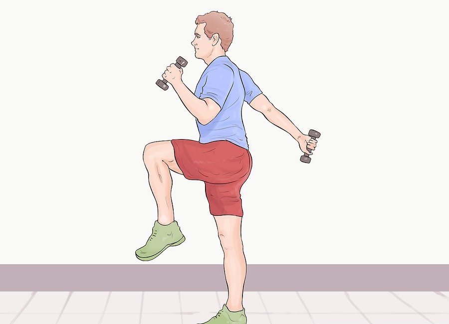 Сделайте 25 подъёмов колена, одновременно работая трицепсом. Для этого упражнения вам понадобятся две гантели. Начните со стоячей исходной позиции, расставив ноги на ширине плеч. Вы должны также согнуть руки в локтях, держа вес перед собой. Вытяните правую руку, и осторожно отведите вытянутую руку назад. Одновременно с этим движением согните левое колено и поднимите левую ногу вперед, пока бедро не будет параллельно земле. Вернитесь в исходное положение. Повторите эти движения другой стороной, чтобы завершить одно повторение. Сделайте в общей сложности 25 повторений, прежде чем отдохнуть в течение 30 секунд