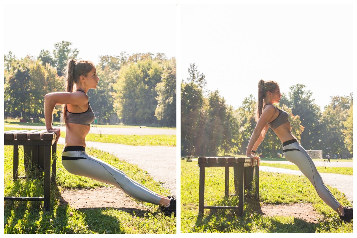 Отжимания на трицепс от скамьи. Выполняются из положения как на фото ниже: ладони на краю горизонтальной лавки, пресс напряжен, локти смотрят строго назад, не разводятся в стороны. На выдохе вытолкнуть вес тела вверх, ощущая работу трицепса. Задержаться вверху на пару секунд, затем медленно опуститься, держа мышцы пресса сильными. В самой нижней точке локти параллельны полу.