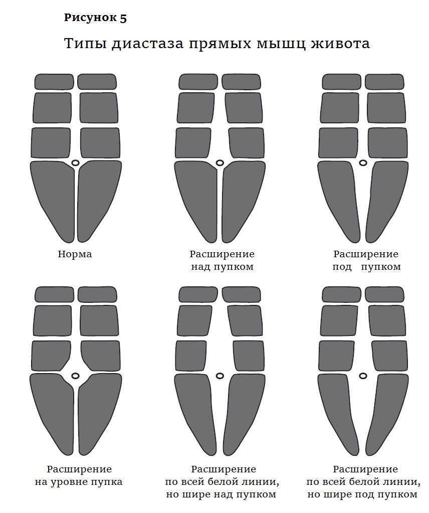 расширение только над пупком (на этот вариант приходится более половины случаев); только под пупком; расширение на уровне пупка; по всей ширине белой линии, но шире над пупком (почти треть случаев); по всей ширине белой линии, но шире под пупком (рис. 5). Таким образом, чаще всего белая линия расширена преимущественно над пупком. Возможно, дело в том, что ниже пупка в составе белой линии больше поперечных волокон, она плотнее и хуже растягивается.
