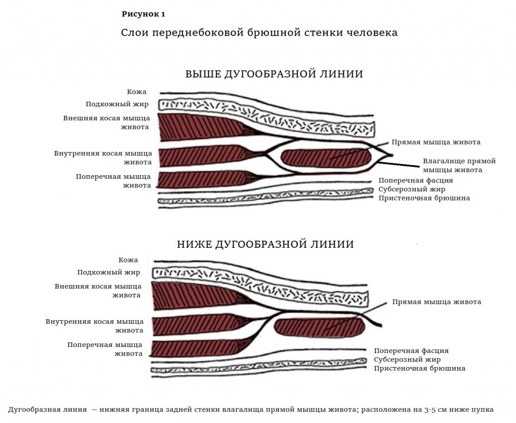 Мышечный слой состоит из четырех парных мышц. Это ориентированные вертикально прямые мышцы живота, внешние и внутренние косые мышцы и горизонтально ориентированные поперечные мышцы, расположенные кнутри от внутренних косых (рис. 2). Апоневрозы косых и поперечных мышц образуют сухожильный футляр прямой мышцы живота — ее влагалище (рис. 1). Прямая мышца, широкая и тонкая в верхней части, в нижней становится толстой и узкой. В нескольких местах она прикрепляется к передней части мышечного влагалища, и эти поперечные сшивки делят прямую мышцу на сегменты. А в середине живота апоневрозы сходятся, образуя белую линию (рис. 2).