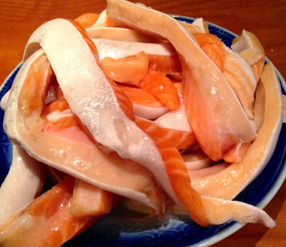 Мясо рыбы, при надавливании пальцем, упругое. Для того чтобы мясо хорошо просолилось, нужно порезать кусочками грамм по 250. Удалить хребет и аккуратно снять кожу.