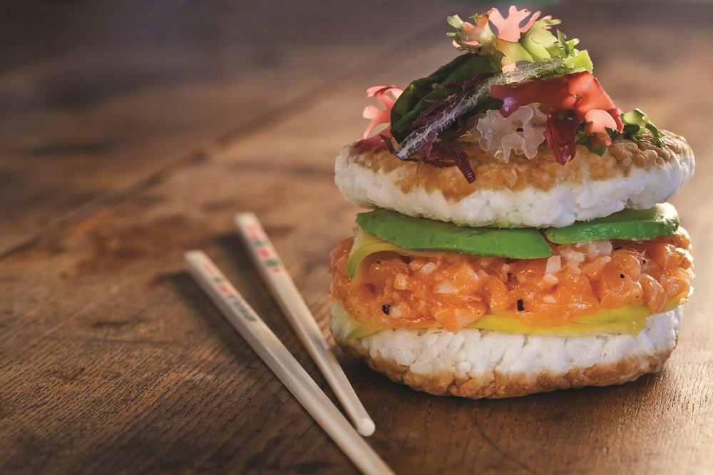 И снова бургер, и снова необычный. Правда, блюдо это скорее ближе к японскому первоисточнику — от бургера в нем только форма, да и та с большой натяжкой. Вместо булочки в нем рис, как и в предыдущем примере слегка обжаренный для того, чтобы не развалился. Некоторые рестораны рис не обжаривают, а просто прессуют, но в этом случае суши-бургер удобнее есть вилкой.