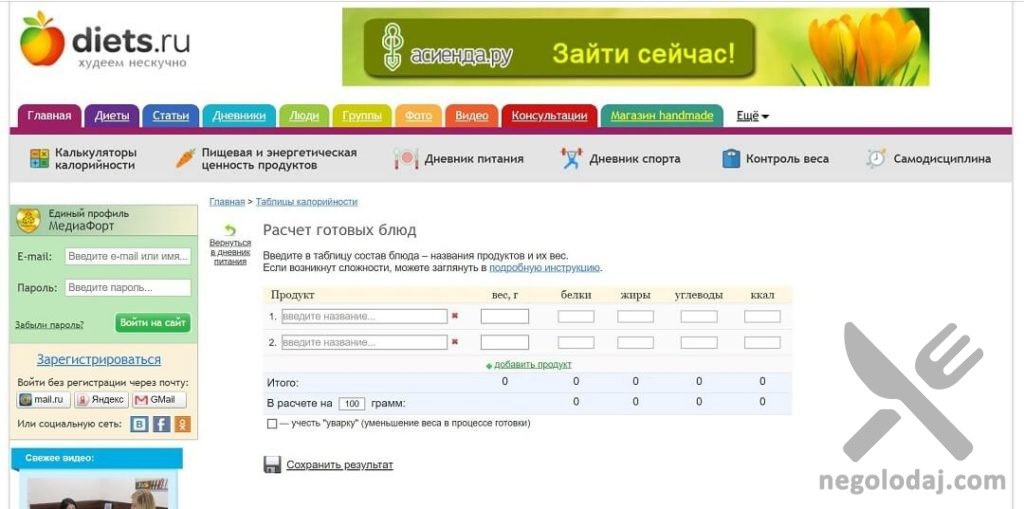 По аналогичной формуле можно рассчитывать содержание любого из макронутриентов (белки, жиры, углеводы) в готовом блюде, по отдельности.