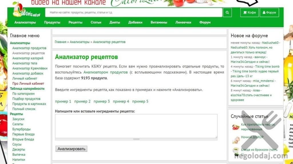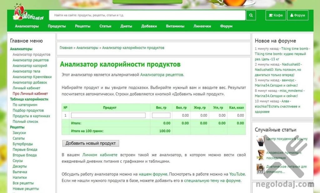 Таблицы калорийности продуктов