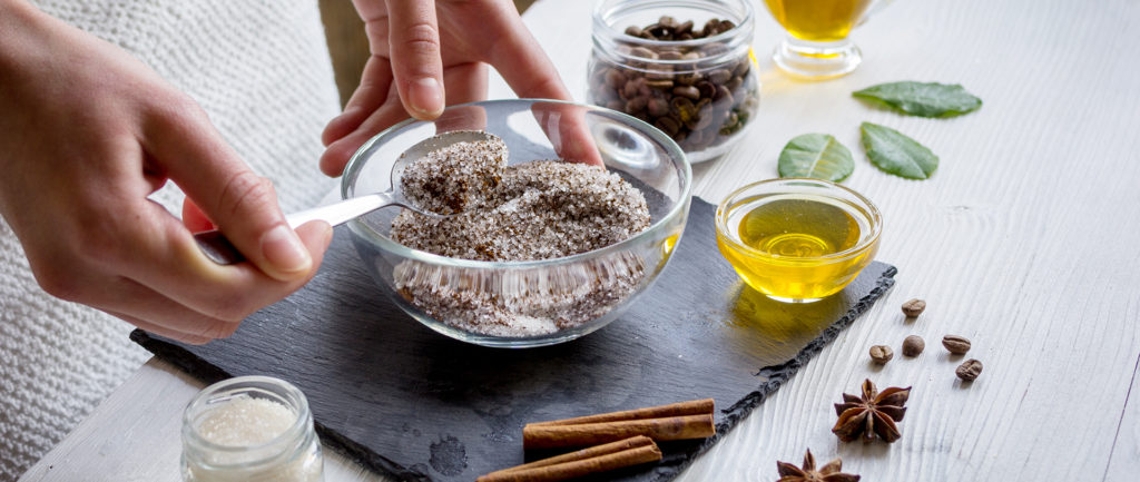 Чтобы сделать средство против целлюлита, нужно две столовые ложки молотого зернового кофе или кофейную гущу смешать с двумя ложками растительного масла (лучше брать оливковое). К этой массе нужно добавить половину чайной ложки корицы, столько же соли и сахара. Все хорошо перемешать. Средство наносится на проблемные участки, их оборачивают полиэтиленом, укрываются одеялом, необходимо полежать полчаса.