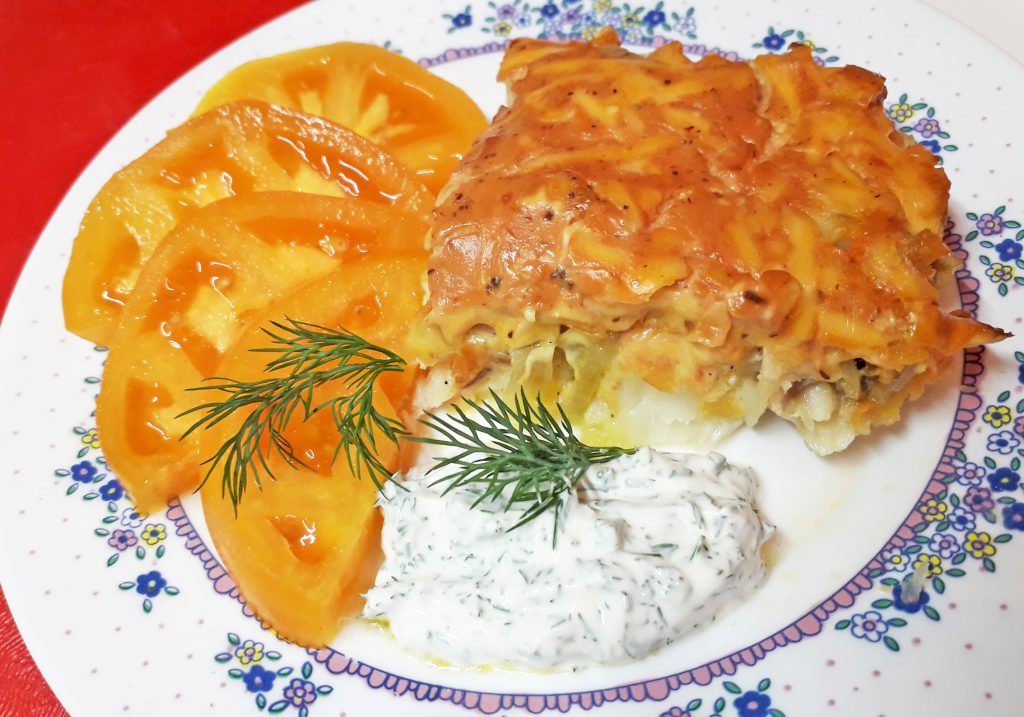 - Следом должны идти подготовленные – обжаренные и тушеные рыбные кусочки. Остается распределить томатные кусочки и оставшийся картофель.