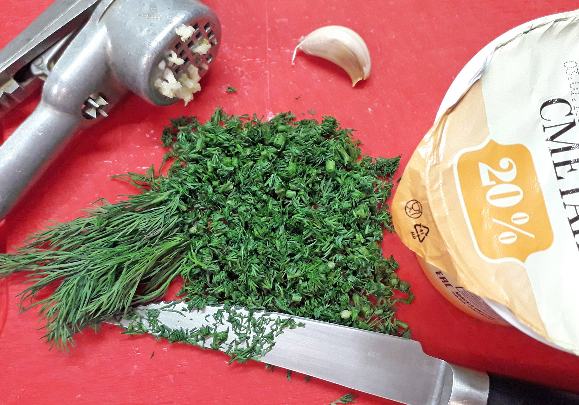 Приготовить чесночный соус с зеленью: мелко порезать ножом пучок любой зелени (петрушка, укроп, зеленый лук) и добавить измельченный чеснок.