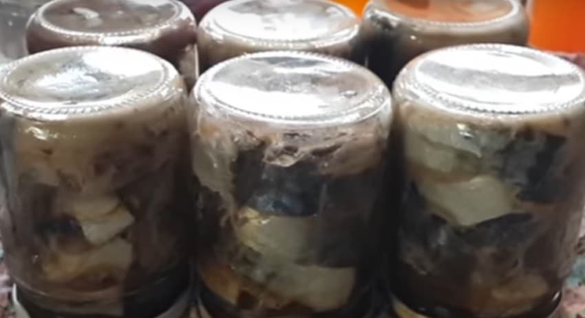 К моменту окончания приготовления раскалить растительное масло. Извлечь банки, влить масло в каждую из них. Снова накрыть их и поставить на полчаса в духовку при той же температуре. После этого достают банки и горячими сразу же закрывают герметично.