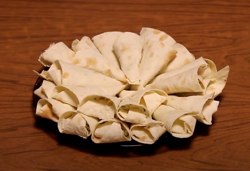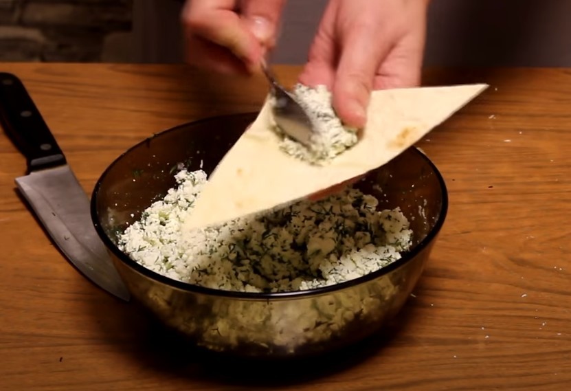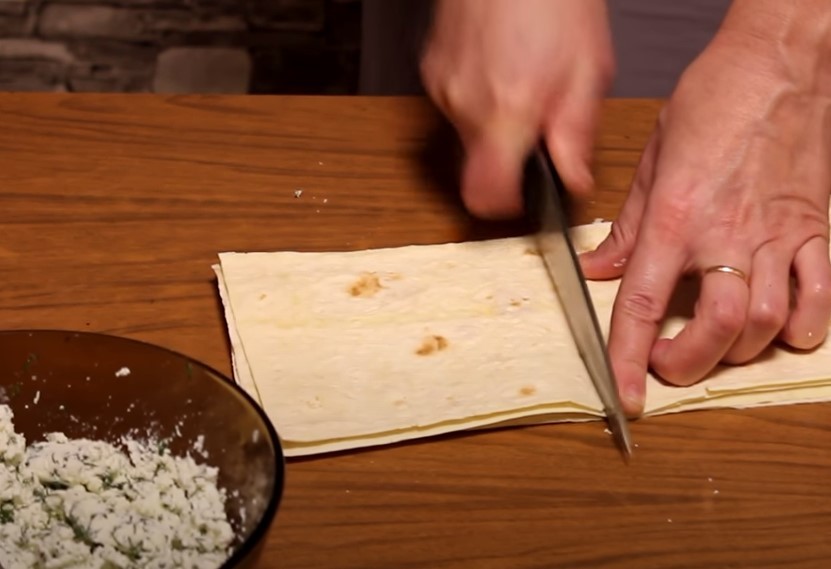 - Лаваш порезать на длинные, узкие прямоугольники. На край каждого выложить немного начинки, свернуть треугольником.